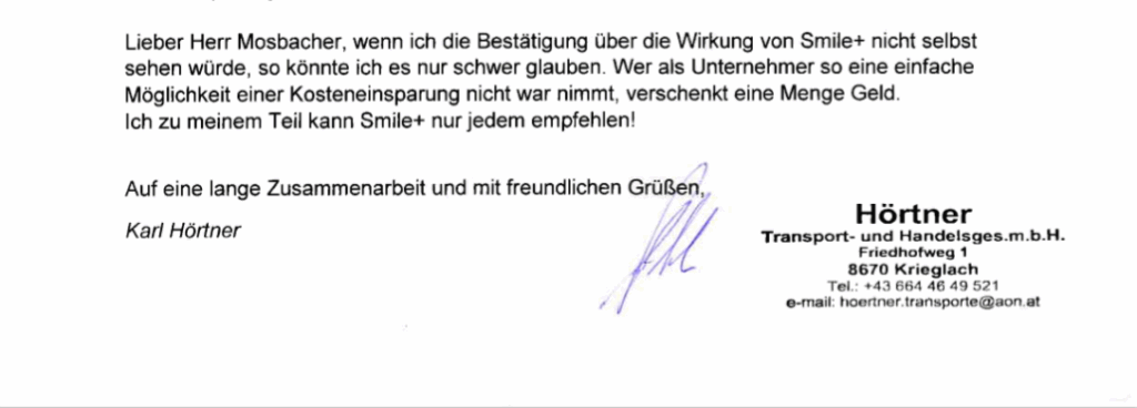 Sehr geehrter Herr Mosbacher! Nach über 3 Jahren Einsatz Ihres Kraftstoff Optimierers Smile+ möchte Ihnen Hörtner Transportunternehmen nun einen kurzen Bericht darüber geben.Wie Sie wissen umfasst unser Fuhrpark mittlerweile 4 LKW der Type Renault T460 Bj.2017, Renault T460 Bj.2016, Renault Premium Route Bj.2011 und Iveco Stralis 460 Bj.2014 sowie einige Kleinfahrzeuge. Unser Jahresbedarf an Kraftstoff […]