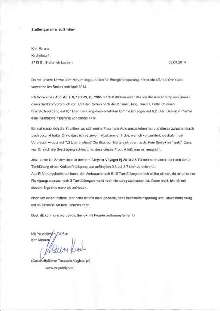 Einmal ergab sich die Situation, wo sich meine Frau mein Auto ausgeliehen hat und dieses zwischendurch auch betankt hatte. Ohne dass ich es zuvor mitbekommen habe, war ich verwundert, weshalb mein Verbrauch wieder auf 7,2 Liter anstieg? Die Situation klärte sich aber rasch. Kein Smile+ im Tank!“ Dass war für mich die Bestätigung schlechthin, dass dieses Produkt hält was es verspricht.